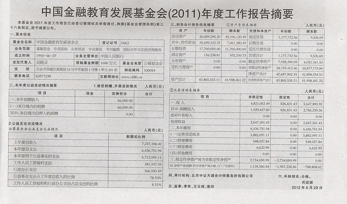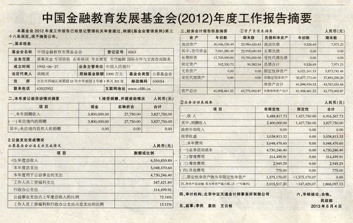 本基金會(2013)年度工作報告已經(jīng)登記管理機關(guān)審查通過,根據(jù)《基金會管理條例》第三十八條規(guī)定,現(xiàn)予摘要公布。 一、基本信息基金會名稱中國金融教育發(fā)展基金會0063登記...