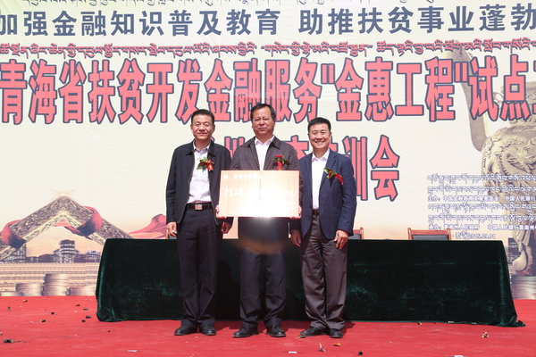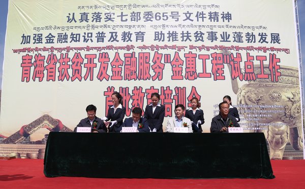 儀式上,黃南州人民政府副州長先巴為活動致辭,中國金融教育發展基金會理事長初本德和中國人民銀行西寧中心支行行長林建華講話,并向黃南州同仁縣、澤庫縣、尖扎縣和河南縣政府頒發“金惠工程”教育培訓試點匾牌,向黃南州政府捐贈了價值65萬元的扶貧物資。中國金融教育發展基金會、青海省金融辦、人民銀行西寧中心支行、青海省財政廳有關領導簽訂了《“金惠工程”合作框架協議》,中國金融教育發展基金會專項部、黃南州財政局、人民銀行黃南州中心支行簽訂了《在黃南州開展“金惠工程”教育培訓(試點)合作備忘錄》,金融機構與貸款戶代表現場簽訂了大學生創業貸款、婦女創業貸款、新型農村經濟組織扶貧貸款、農戶扶貧貸款合同。