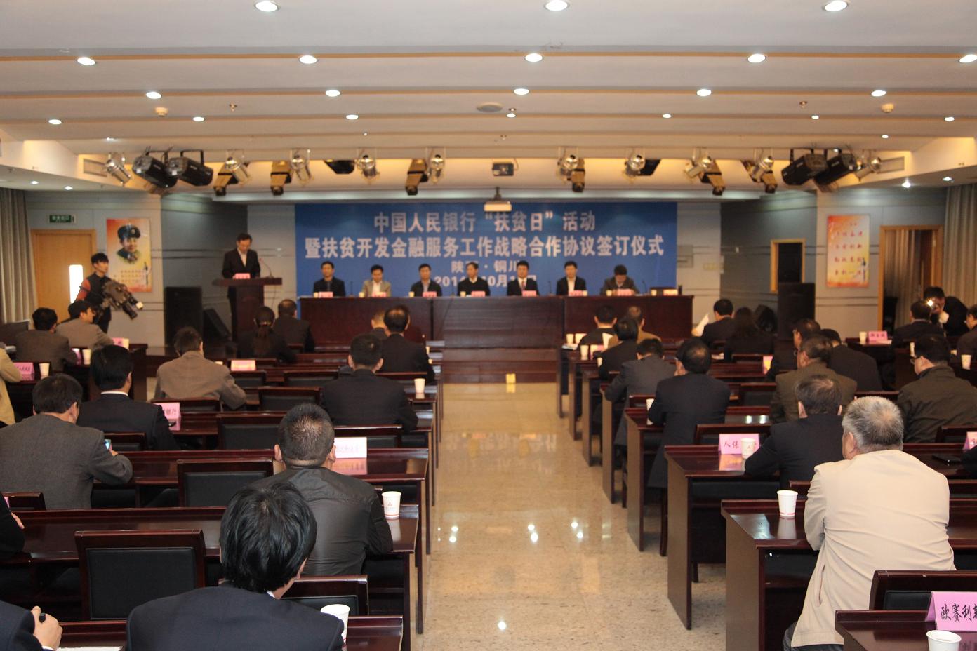 10月17日,是我國首個“扶貧日”。中國人民銀行“扶貧日”活動啟動暨扶貧開發金融服務工作戰略合作協議簽訂儀式在銅川市舉行。銅川市市長郭大為、中國人民銀行機關黨委常務副書記齊小東、中國金融教育發展基金會理事長初本德出席,副市長李彬致辭,中國人民銀行金融市場司副司長林建華主持。